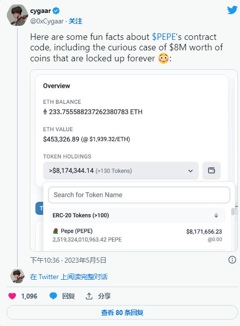 加密爱好者@0xCygaar 最近分享了一些关于 PEPE 合约代码的有趣事实,并指出价值近 800 万美元的代币已被永久锁定。