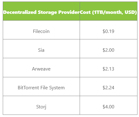 1TB 的去中心化数据存储每月的价格从 Filecoin 的 0.19 美元到 Storj 的 4.00 美元不等。2023 年,平均每月 1TB 的去中心化数据存储费用为 2.11 美元。