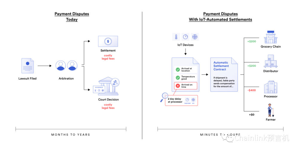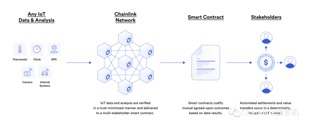 有了物联网设备和数据、Chainlink去中心化的预言机网络以及智能合约,就可以完美实现多方协议