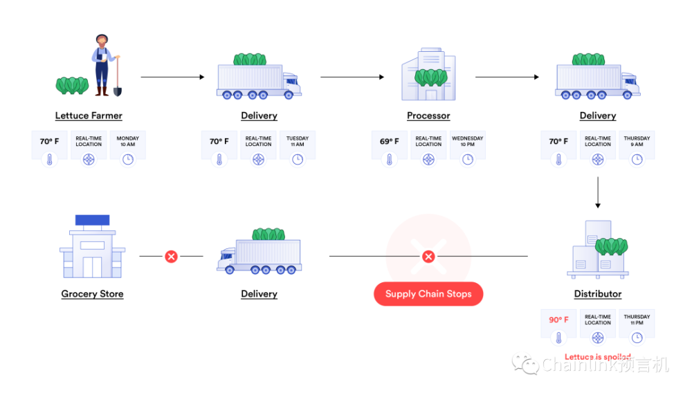 我们还是继续刚才生菜供应链的例子,以更直观地理解这背后的逻辑。我们可以定制化一个Chainlink去中心化的预言机网络,其中所有节点都可以独立监控供应链各个环节的物联网设备,当生菜坏掉时触发智能合约执行,并附上时间戳、温度和地点信息。